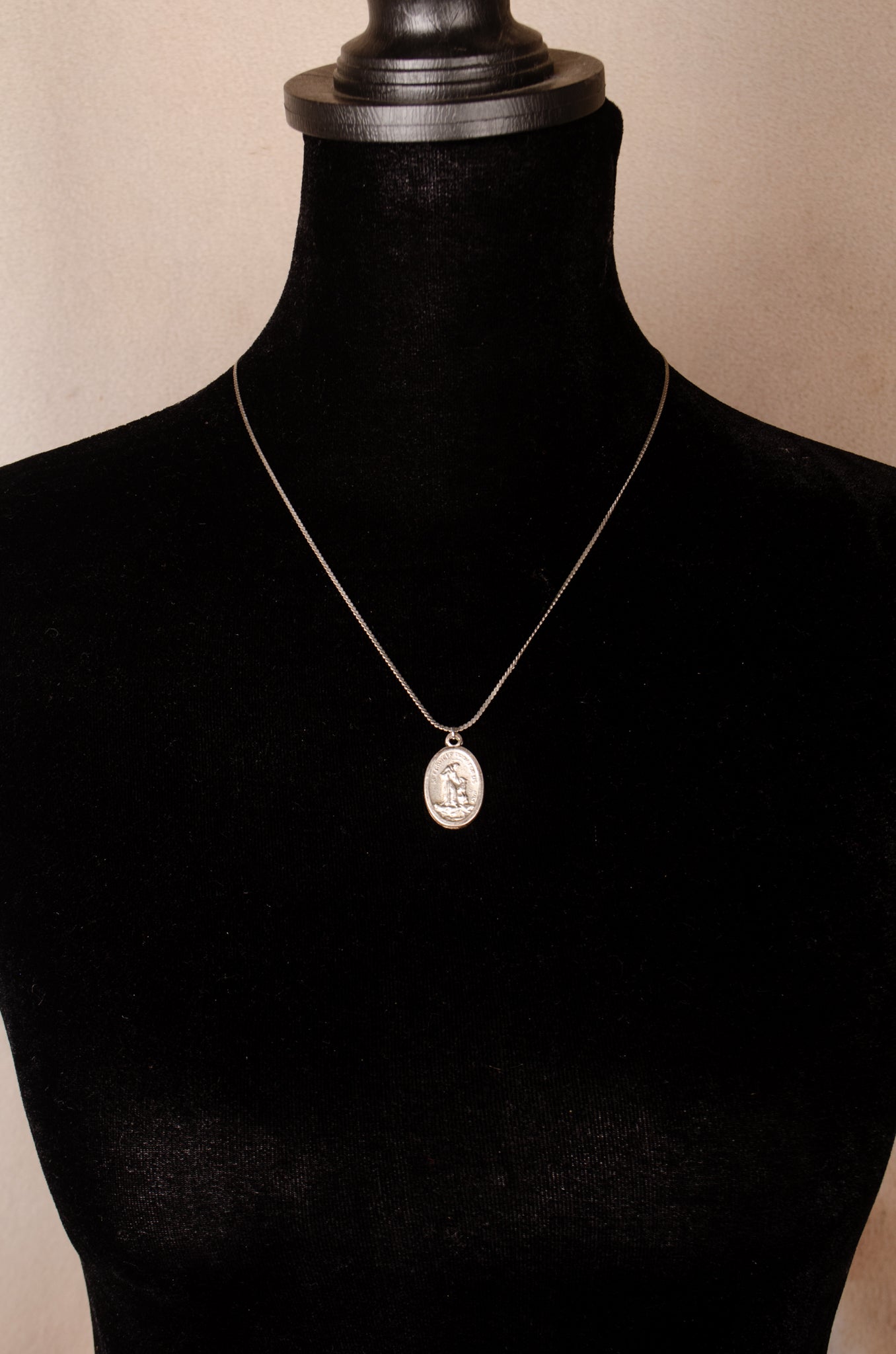 Vintage religious medal featuring Saint Anthony, the patron Saint of lost items, travelers and the poor. He is holding the infant Jesus and a lily, symbolizing his devotion to Christ and purity