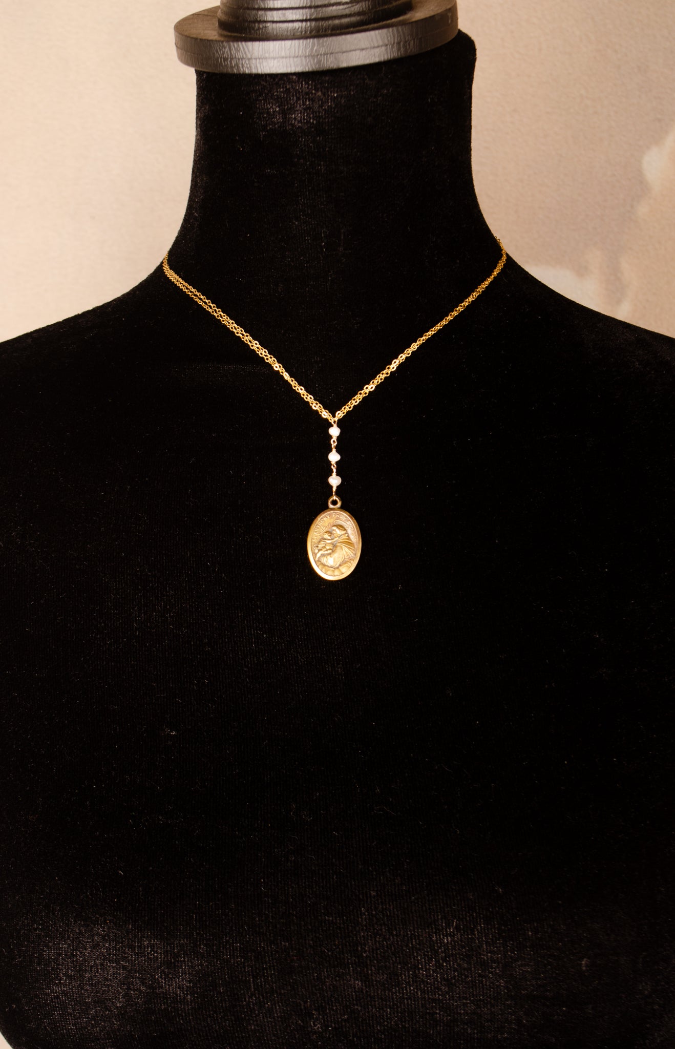 Vintage religious medal featuring Saint Anthony, the patron Saint of lost items, travelers and the poor. He is holding the infant Jesus and a lily, symbolizing his devotion to Christ and purity.